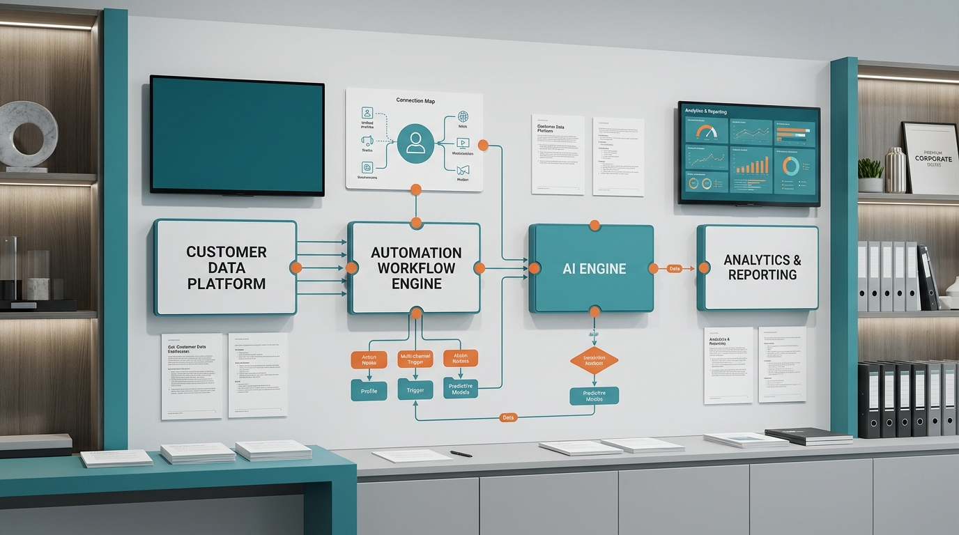 An enterprise architecture view showing the main components of an AI Automation Marketing system including data, workflow, AI engine, and reporting