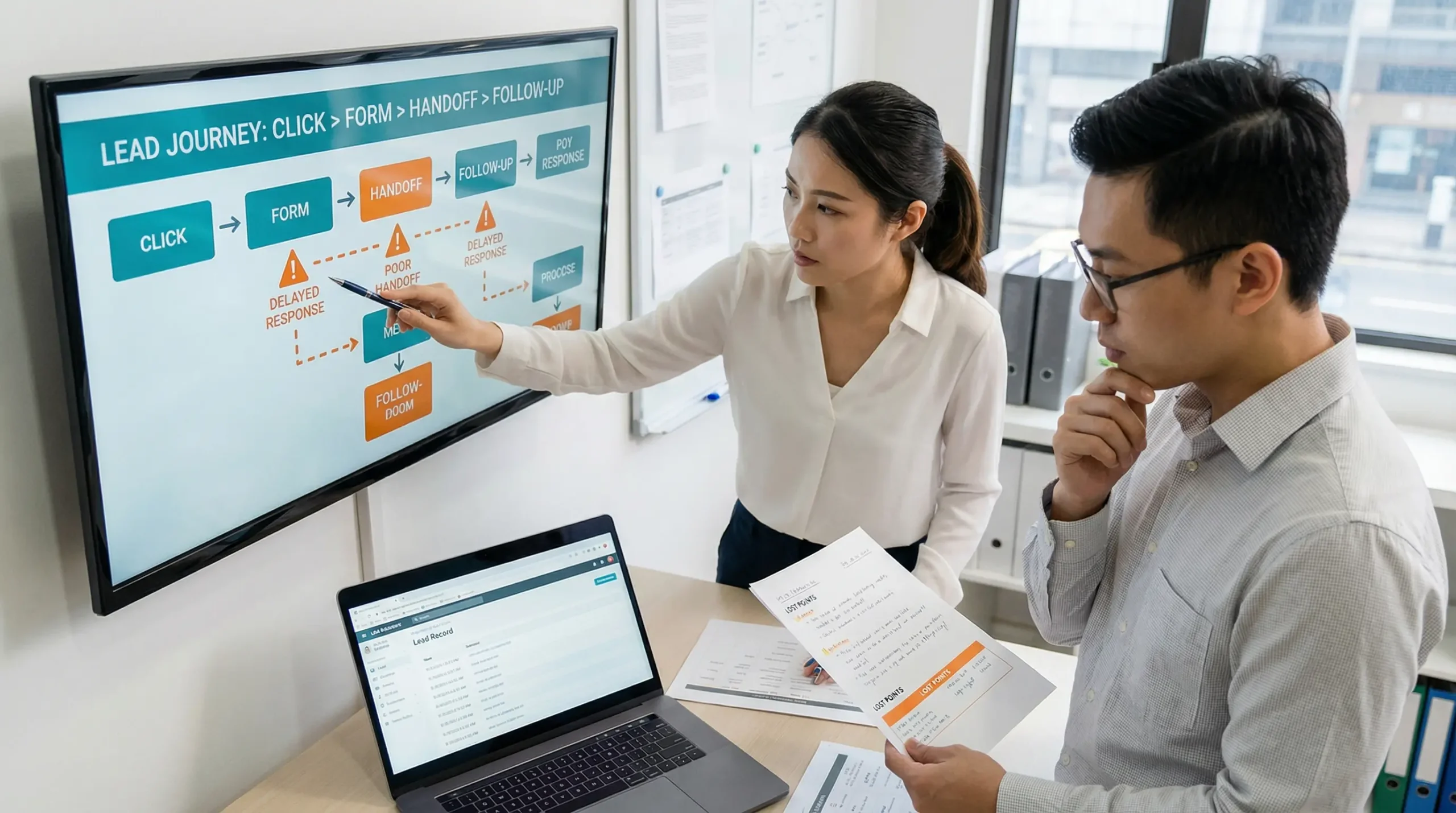 Hai nhân sự doanh nghiệp rà soát các bước sau quảng cáo để tìm nơi lead bị thất thoát