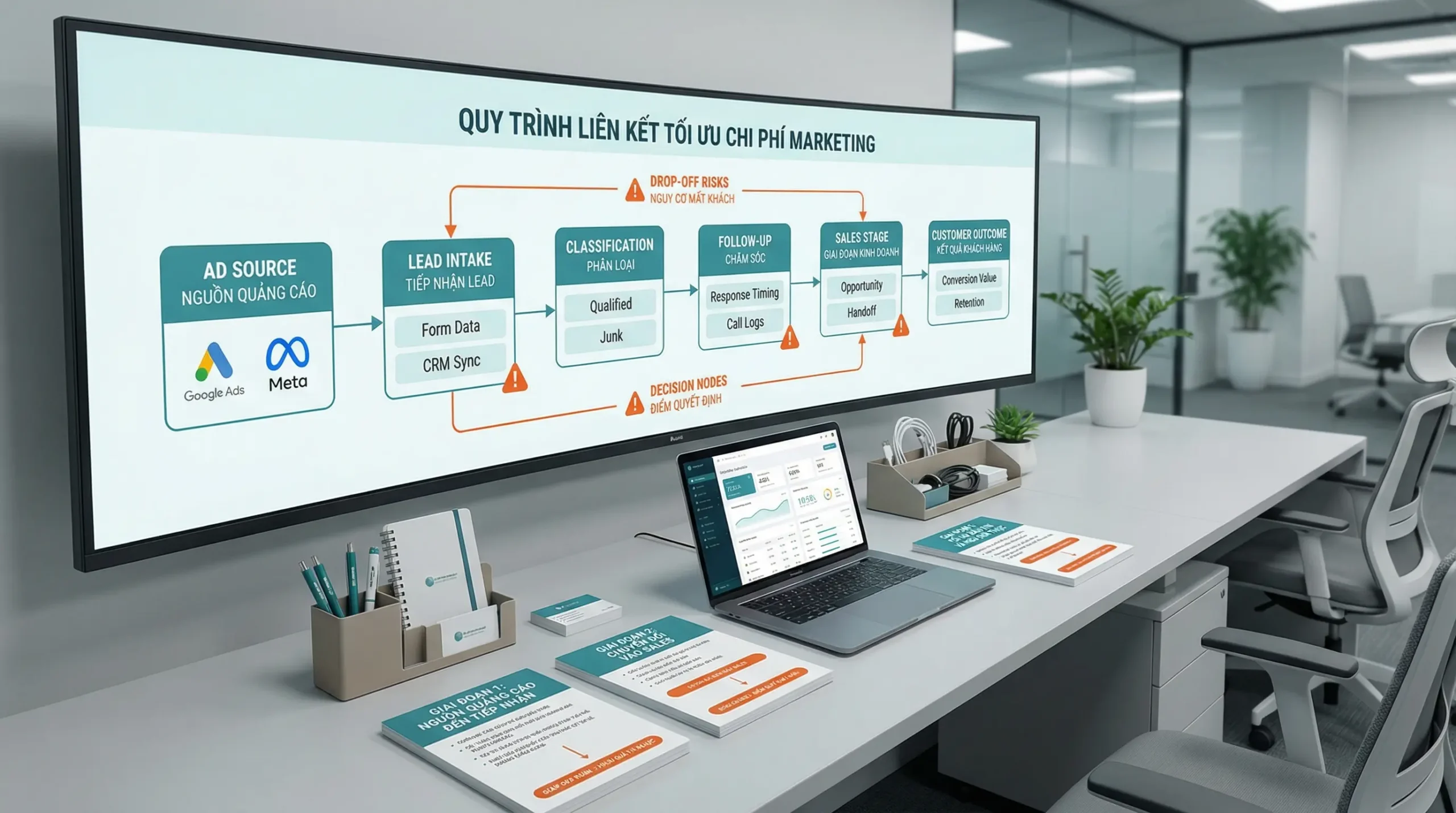 Không gian vận hành hiển thị hành trình lead sau quảng cáo bị rò rỉ khiến ngân sách marketing bị lãng phí